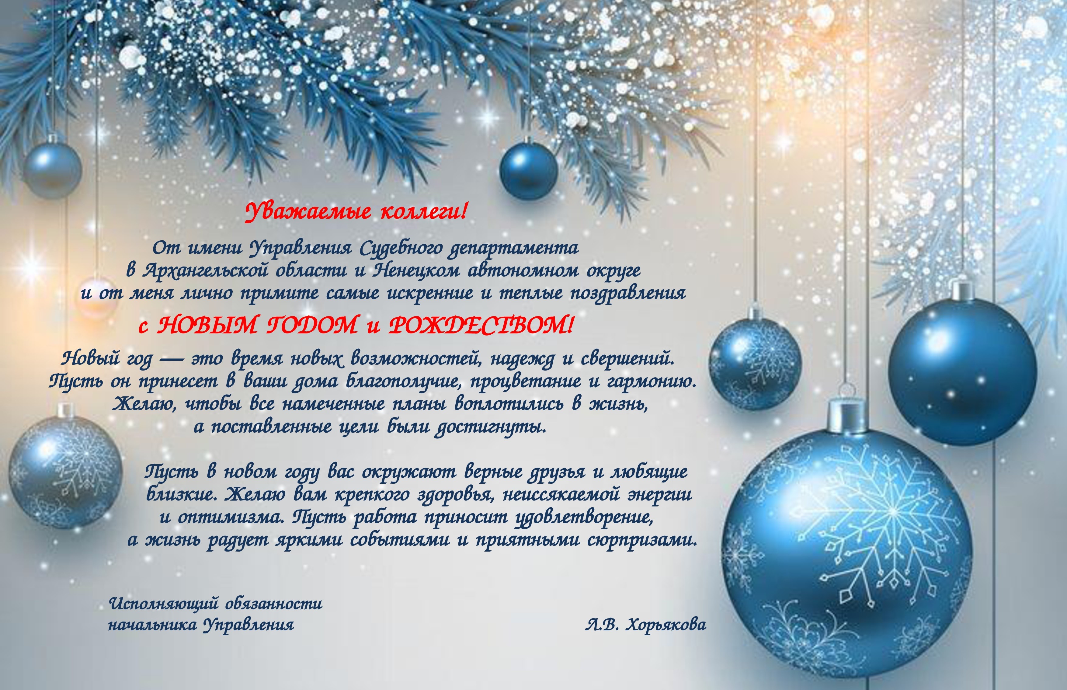 | Поздравление исполняющего обязанности начальника Управления Судебного департамента в Архангельской области и Ненецком автономном округе Л.В. Хорьяковой с Новым годом и Рождеством | версия для печати |